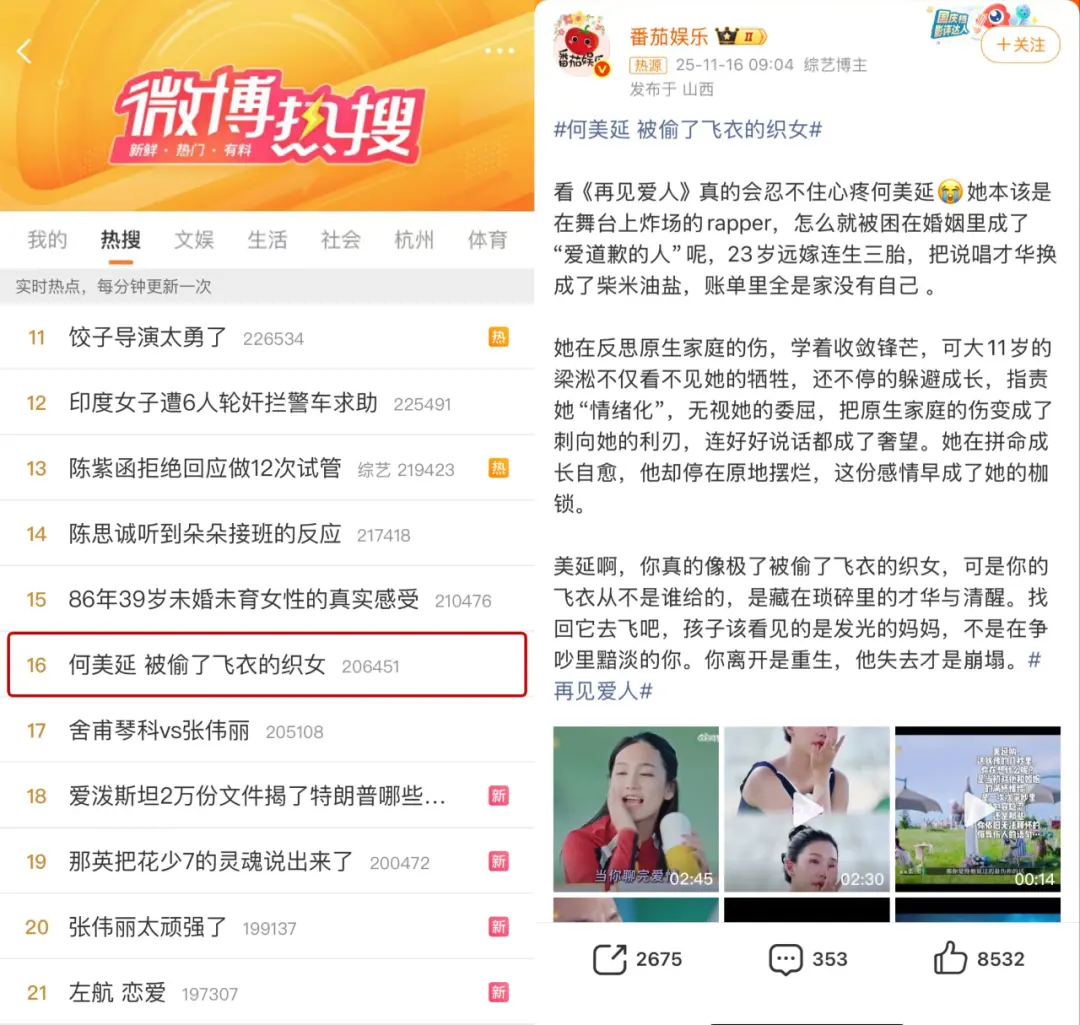 所以大家会将#何美延请成为你自己故事里的中心# #何美延被偷了飞衣的织女# 刷上热搜。