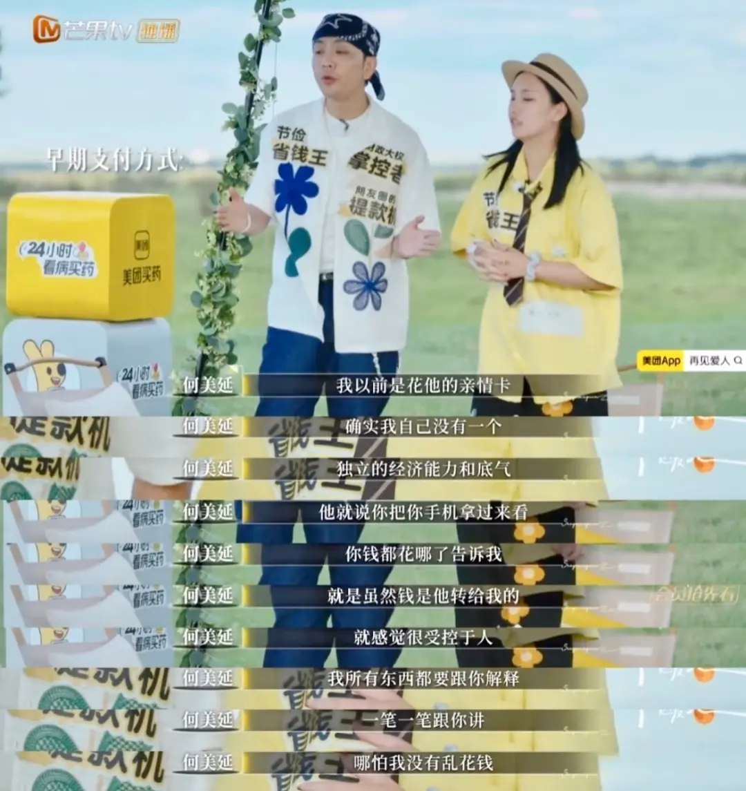 转折点就是第三期的“金钱人格标签”环节。当时,两人给对方贴标签,何美延给梁淞贴了“财政大权掌控者”,而俩人都给彼此贴了“节约省钱王”。这个标签像个钩子,把藏在争吵背后的核心矛盾勾了出来——经济地位决定的话语权失衡。