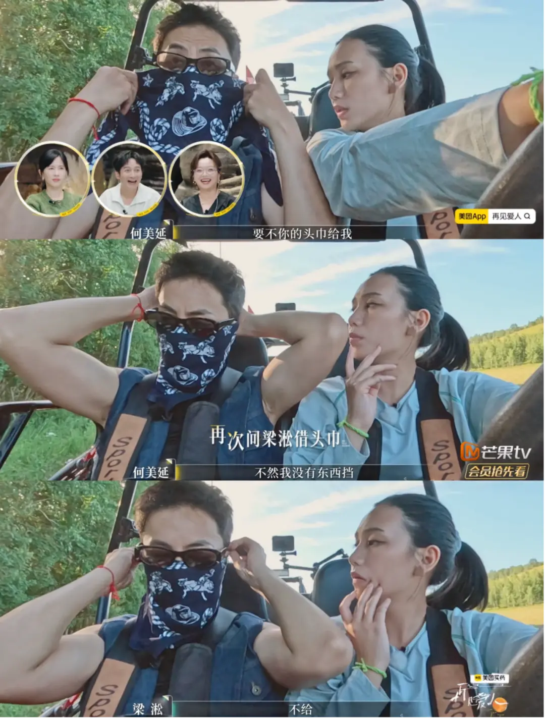 嘉宾们玩UTV户外越野车,到了场地大家才发现风沙比预想的大,梁淞早有准备带了面巾,何美延见状就问能不能借自己用。梁淞嘴上说着“愿意”,身体却犹豫,只让何美延用帽子挡挡。