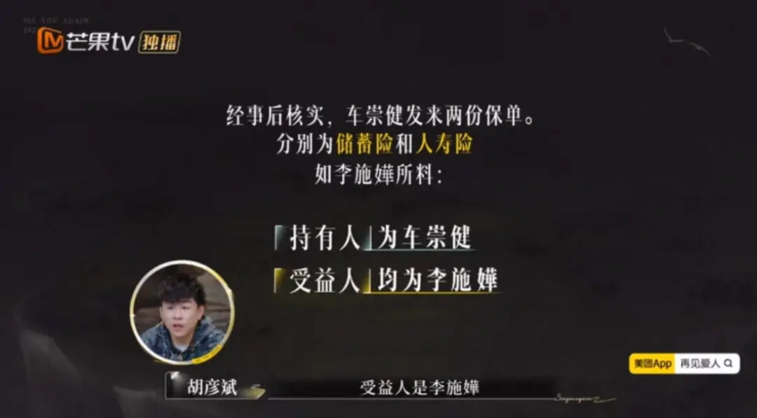 随后节目组补充了真实情况:车崇健买的不是重疾险,是自己名下的储蓄险加人寿险,只不过受益人写了李施嬅的名字。